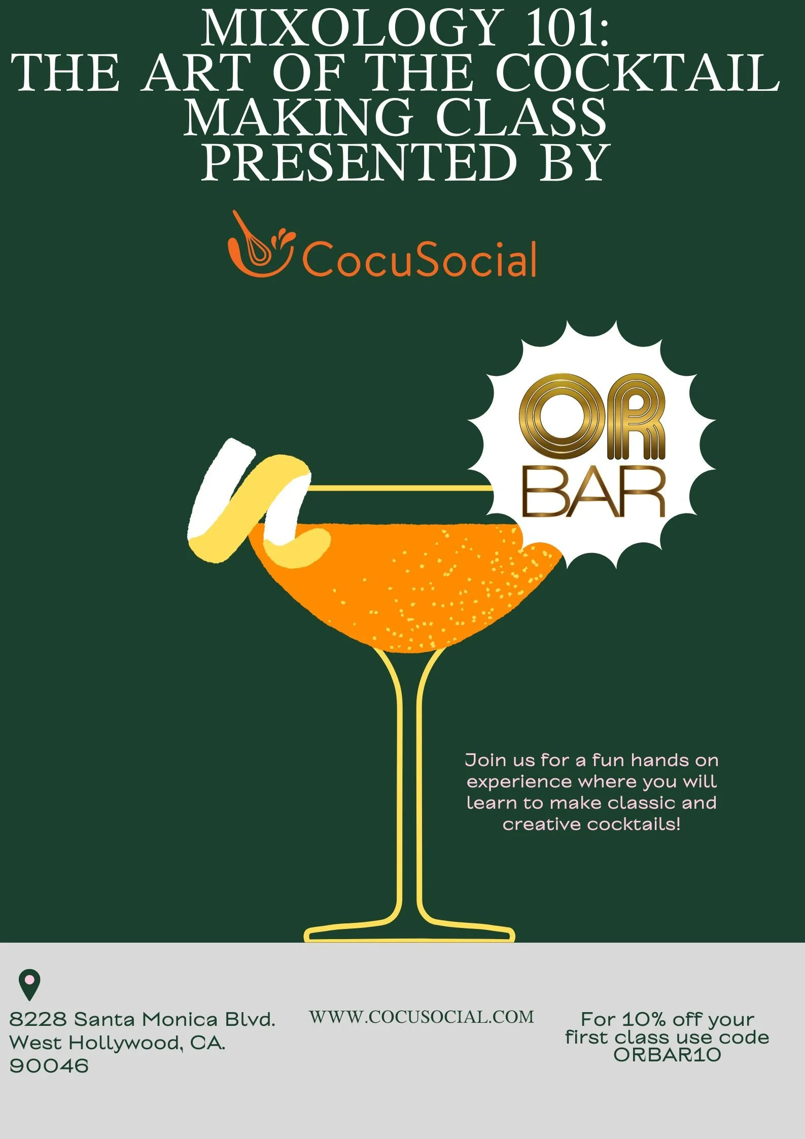 The instructor will demonstrate each cocktail on the menu, giving you the opportunity to taste them all. Each student will be paired with a partner and have the opportunity to make their two favorites from the list.